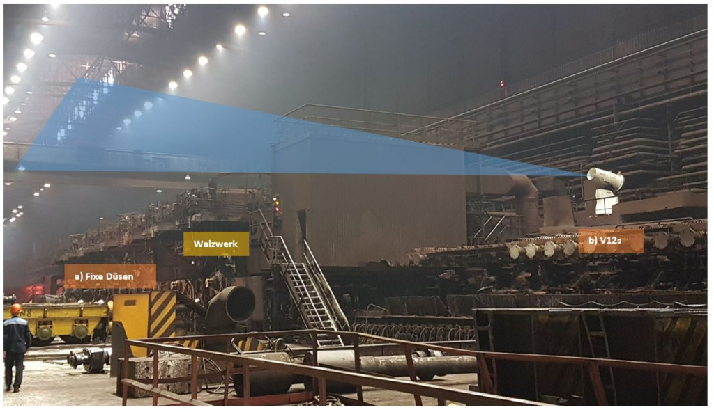 b) Zusätzlich haben wir eine V12s auf dem Walzwerk angebracht. Der Schwenkwinkel der Turbine wurde auf 20° eingestellt, somit kann sie die Fläche über dem Walzwerk abdecken und die dortige Staubbildung eindämmen. Für die Turbine der V12s wurden Düsen 1.0 verwendet, die weniger Wasser konsumieren und somit einen sehr feinen und vor allem äußerst strukturschonend Wassernebel produzieren.